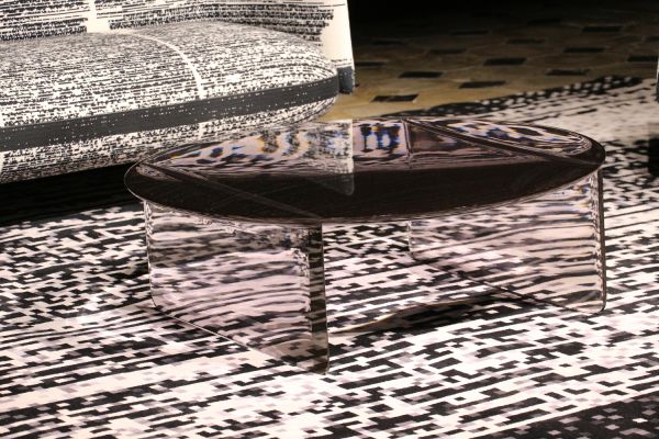 Table en polyméthacrylate de méthyle fumé et poli. Cette table compte-fils fait partie d’un ensemble de salon comprenant un canapé et deux fauteuils conçus par les designers A+A Cooren, en collaboration avec l’artiste Miguel Chevalier, auteur d’un tapis de Savonnerie aux motifs de pixels. Le meuble, posé sur le tapis, permet de créer un effet de loupe, à même de magnifier la matière et la technique de la Savonnerie.