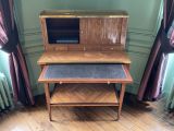 Bureau de dame dit "bonheur du jour" à décor de frisage et filets en bois de violette et buis, composé d'un cartonnier à galerie ajourée de bronze, rideau coulissant à lamelles marquetées en chevrons et reposant sur trois tiroirs, et d'une tablette avec quatre tiroirs en deux rangées à entrée de serrure en écu, le tout reposant sur quatre pieds en gaine reliés par une tablette d'entretoise.