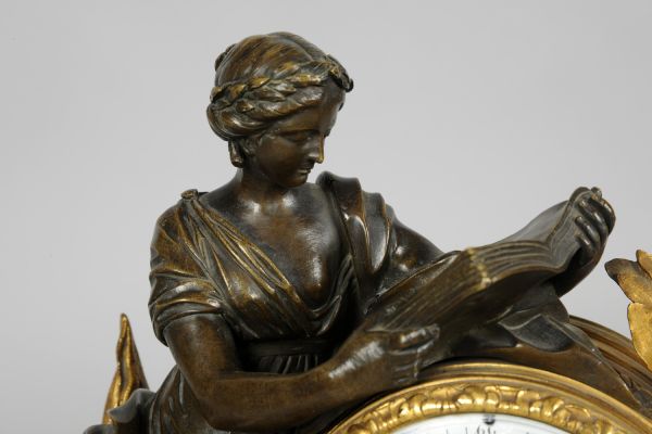Cadran d'émail à chiffres Romains sur lequel s'appuie une liseuse en bronze patiné assise sur un tronc d'arbre en bronze doré entre le cadran et la liseuse. Se deverse une corne d'abondance pleine de fleurs, sur le côté droit du cadran une branche de laurier remonte. Dorure au mercure, le tout repose sur un socle de marbre blanc évidé afin de permettre le mouvement du balancier.