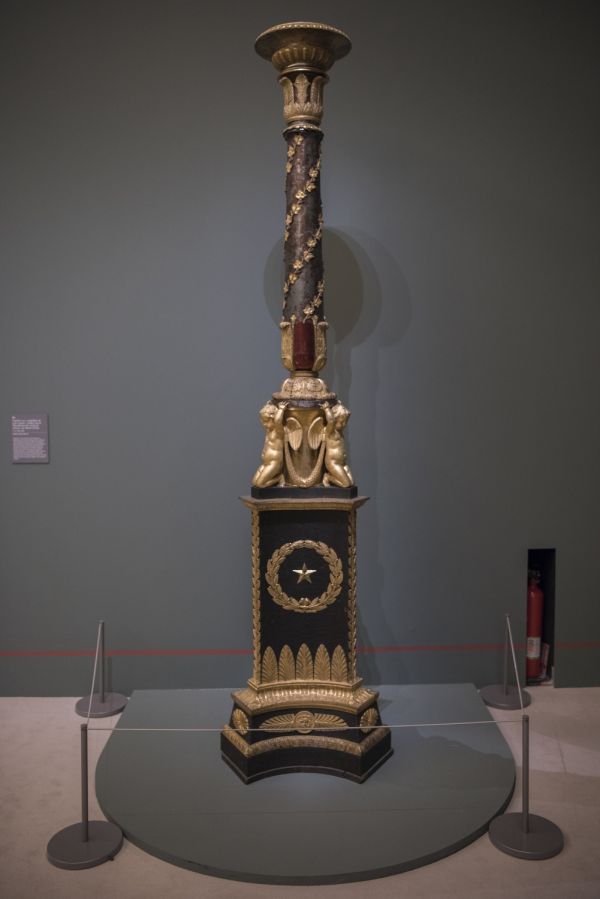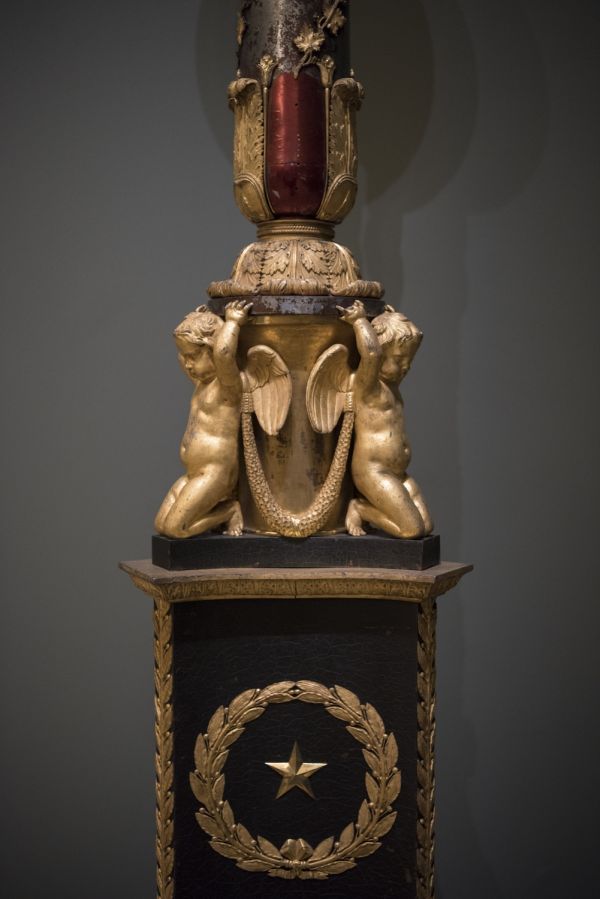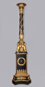 Au dessus : Trois enfant nus ailés, réunis par des guirlandes, les bras levés, adossées à une base circulaire portant un piédouche ciselé de feuilles d'acanthe; le haut en culots engainant la colonne légèrement conique, torsadée de feuilles et graines; le chapiteau orné de trois feuilles en plame, altérnées de culots et palmettes, porte une coupe a base godronnée, gorge en cavet uni et bord quart de rond à godrons.