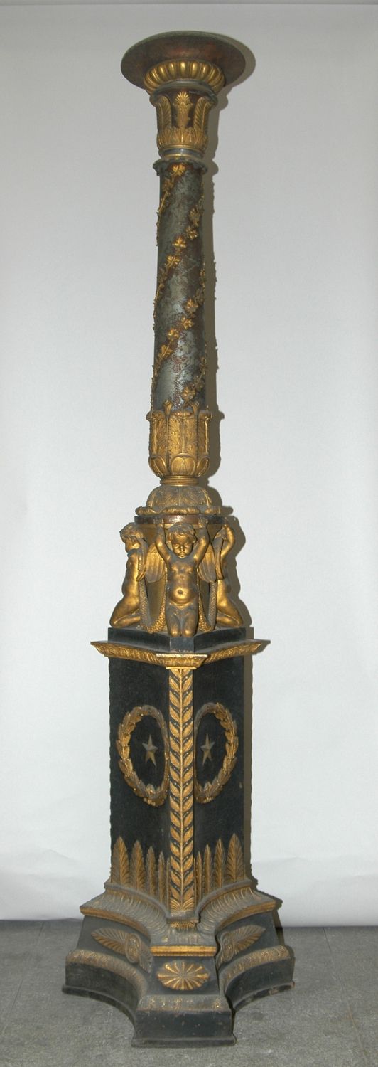 Bronze ciselé, doré, vert antique. Socle triangulaire, à facess concaves, orné à la base de moulures palmettes, culots et feuilles ciselées, puis de motifs, rosaces ovales, médaillon à tête de méduse, porté par palmette horizontale, couronne de laurier avec étoile au centre, feuilles d'eau en palmettes et tige de laurier rectiligne. Le tout doré sur fond uni, vert antique.