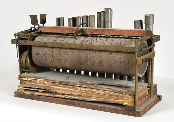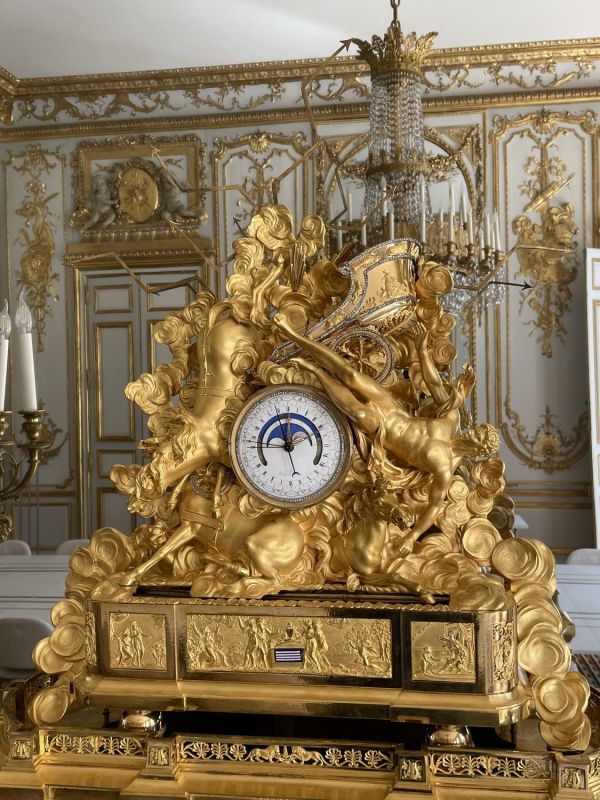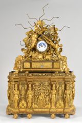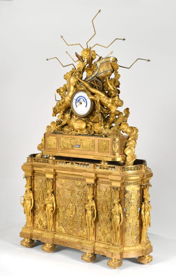 Grand socle rectangulaire à extrémités demi-cercle monté sur huit patins carrés à partie centrale tournée, base moulurée à six saillies portant six cariatides avec attributs de musique panneaux chargés d'ornements, rinceaux et entrelacs médaillons sphinx renommées etc ; en fine ciselures dorées "mat mercure" sur fond doré bruni. Corniche moulurée ornée de palmettes et galerie ajourée formant petite balustrade. Sur ce socle se pose la pendule sur quatre patins en boule, socle orné de panneaux bas relief à cadre bruni portant un groupe "la chute de Phaéton". Au milieu de nuages foudre et éclairs e rayons le char brisé, les chevaux mêlés gisants et Phaéton tombant.