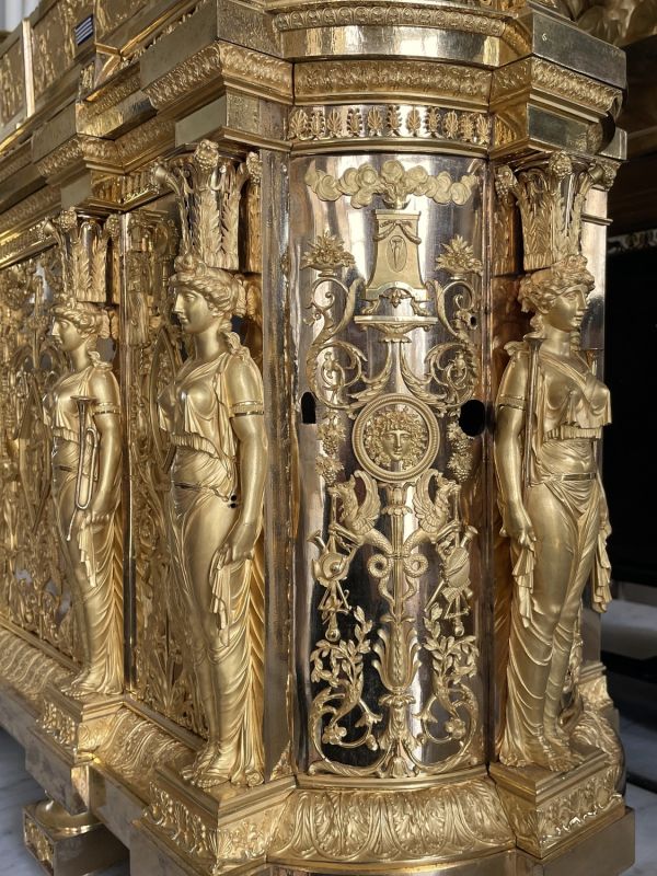 Grand socle rectangulaire à extrémités demi-cercle monté sur 8 patins carrés à partie centrale tournée, base moulurée à 6 saillies portant 6 cariatides avec attributs de musique panneaux chargés d'ornements, rinceaux et entrelacs médaillons sphinx renommées etc ; en fine ciselures dorées "mat mercure" sur fond doré bruni. Corniche moulurée ornée de palmettes et galerie ajourée formant petite balustrade. Sur ce socle se pose la pendule sur 4 patins en boule, socle orné de panneaux bas relief à cadre bruni portant un groupe "la chute de Phaéton". Au milieu de nuages foudre et éclairs e rayons le char brisé, les chevaux mêlés gisants et Phaéton tombant.