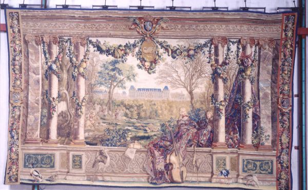 Sur le devant, un sanglier fait tête aux chiens ; des cavaliers débouchent d'un bois. Au fond, longue façade du château, entre deux pavillons, au-dessus des arbres. De chaque côté, un pilastre, un Terme d'homme et une femme enguirlandés. Balustrade pleine, à dessins réguliers, sur laquelle est posé un tapis et est appuyée une contrebasse. A gauche, paraît le long cou d'une autruche. Deux hommes, débout derrière la balustrade, soulèvent le tapis. Sur la balustrade, un violon et du papier à musique. Oiseaux à hautes pattes et long cou sur le devant. Bordure de chute de fleurs sur les côtés, avec les chiffres du Roi au milieu. Une rangée de fleurs de lys dans le haut, armes royales au centre.