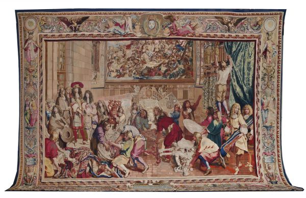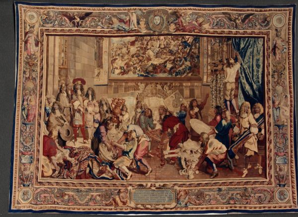 Projet d’inspiration politique, initié par Colbert voire Louis XIV lui-même, la tenture de L’Histoire du roi s’inscrit dans une ancienne tradition monarchique française qui consistait à narrer sous forme de tapisseries ou de fresques les hauts faits des rois. À partir d’un programme conçu par la Petite Académie, Le Brun ébaucha dès 1664, un premier ensemble de sujets allégoriques dans lesquels Louis XIV apparaissait accompagné de divinités olympiennes, qui furent refusées par le roi au profit de scènes situées dans la réalité présente. Sous sa forme définitive, la tenture comprit 14 sujets consacrés aux grands événements civils politiques ou militaires des premières années du règne de Louis XIV, depuis son sacre (7 juin 1654) jusqu’à la prise de Dôle (14 février 1668), quatre scènes relatant plus particulièrement des épisodes de la guerre de Dévolution (1667-1668). Le Brun s’adjoignit pour composer une partie des scènes le peintre paysagiste Adam-Frans van der Meulen, en France depuis 1664. Il fallut presque quinze ans (1665-1679) aux ateliers des Gobelins pour réaliser le tissage de cette première tenture de haute lisse. Les somptueuses bordures des tapisseries, remplies d’allégories, dont le dessin est l’œuvre de Jean Lemoyne le Lorrain (v. 1638-1709), portent exceptionnellement les dates de début et de fin de chaque tissage (Vittet-Brejon, 2010, p. 185).